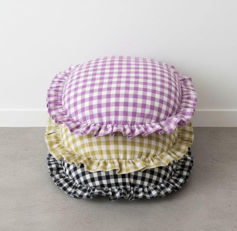 Add a playful pop of color to your space with this round ruffled pillow, designed to be both eye-catching and cozy. Featuring bold gingham fabric and a charming ruffled edge, this pillow is a perfect statement piece for boho, retro, and eclectic interiors.