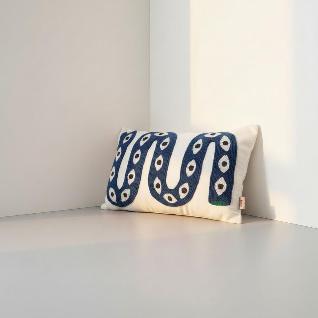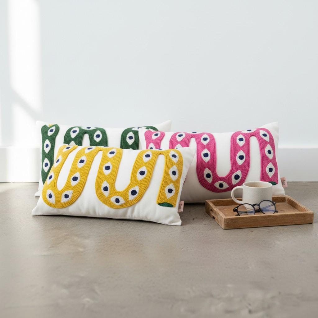 Handmade Snake Punch Embroidered Pillow Cover – Eclectic Boho Decor - Colorful Boho Cushion - Unique Eye Pattern Throw Pillow - Modern Home Decor Gift