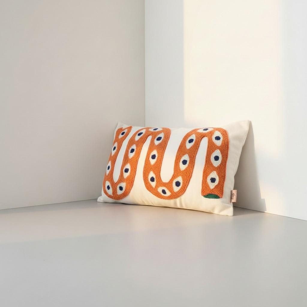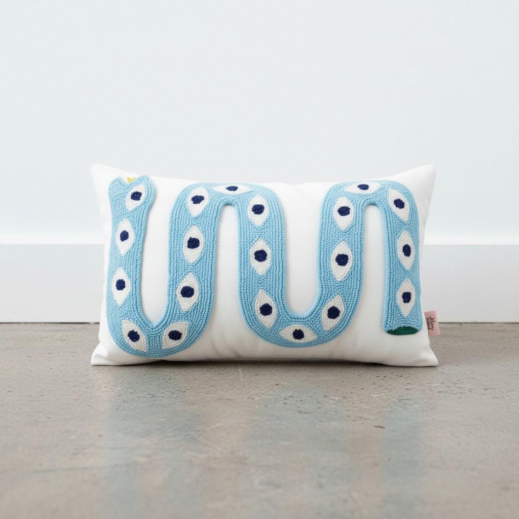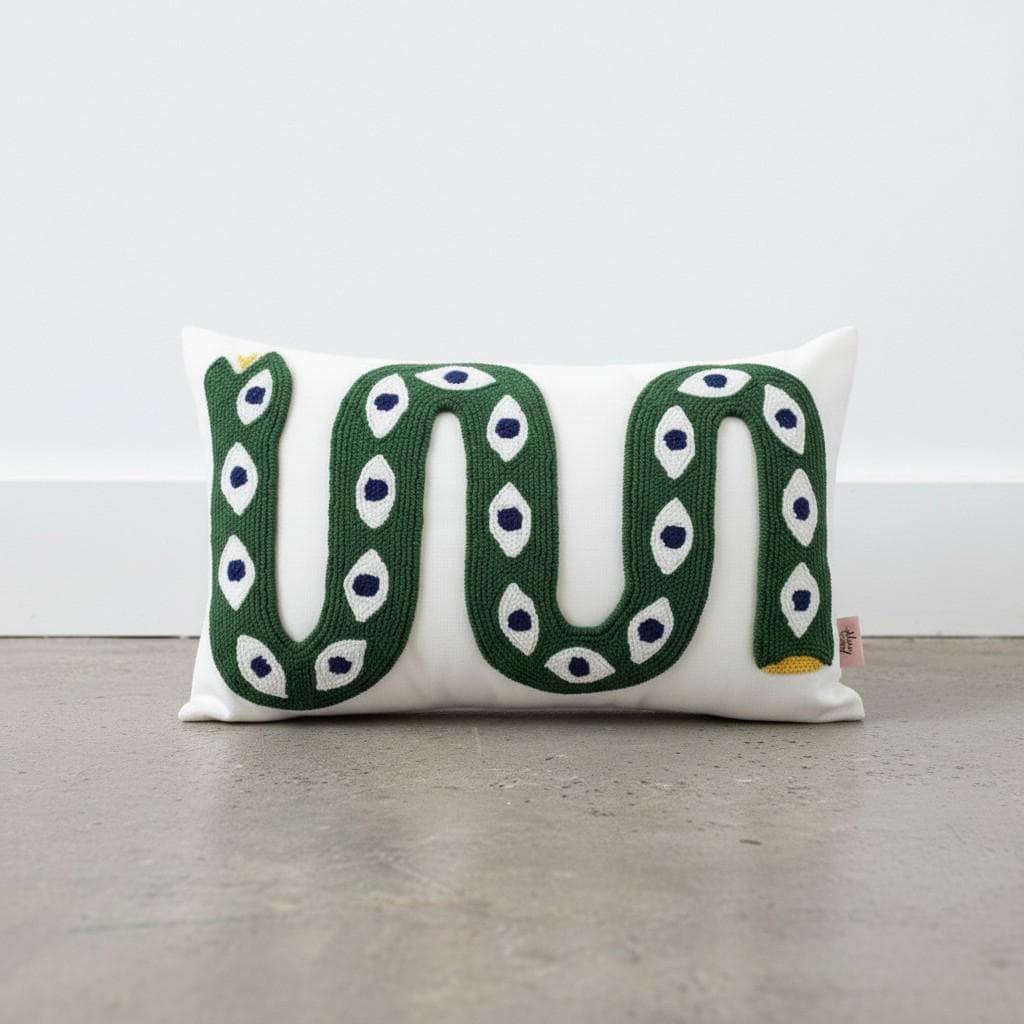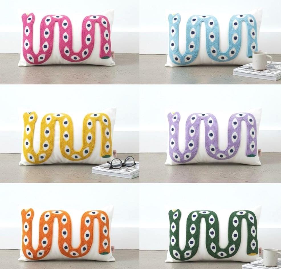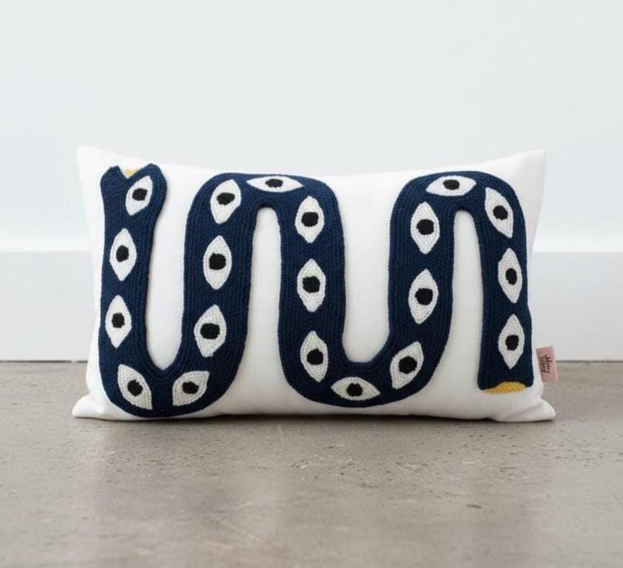 Bring a bold artistic touch to your home with this handmade snake pillow cover, designed for lovers of unique and eclectic decor. This eye-catching piece features a vibrant snake motif with an intricate eye pattern, perfect for adding a statement to any boho-inspired space.